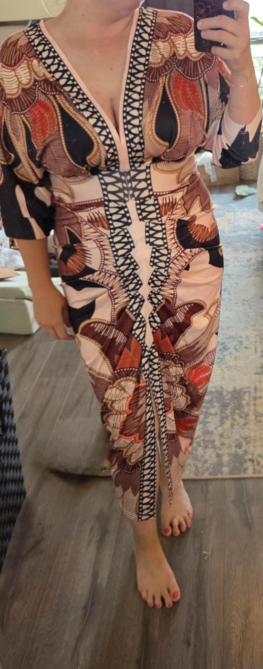 • Características del diseño: El escote en V profundo y la falda con abertura realzan la figura (la cintura ceñida alarga las piernas), el estampado floral aporta un toque de estilo; se adaptan a todo tipo de cuerpos y su largo hasta el tobillo irradia elegancia.